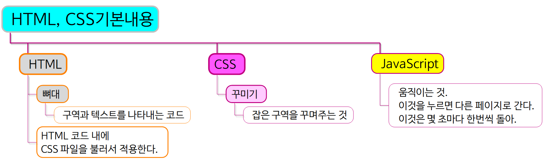 HTML, CSS, JS(JavaScript)가 무엇인지 간단히 개념을 잡아보자. HTML은 뼈대와 같다. 구역과 텍스트를 나타내는 코드이다. HTML 코드 내에 CSS파일을 불러서 적용한다. CSS는 꾸미기를 하는 것이다. 잡은 구역을 꾸며주는 것을 말한다. JavaScript는 움직이는 것. 이것을 누르면 다른 페이지로 가고, 이것을 몇 초마다 한번씩 돌아가는 것 등을 말한다.